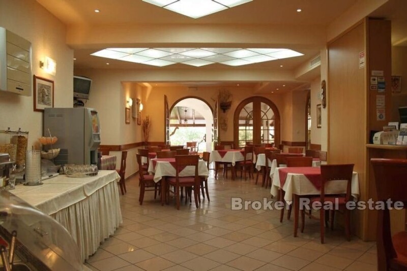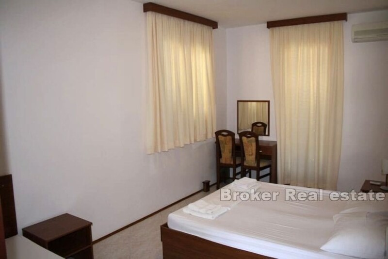 Small hotel with a restaurant, pool and sea view located in an attractive location on Čiovo, 100 m from the sea. The south-facing hotel with a living area of 1,280 m2 extends over six floors – basement, ground floor and four floors. In the basement there is a restaurant with kitchen, reception, three toilets and two storage rooms. On the ground floor there are three bedrooms with attached bathrooms and access to the balcony, two one-room apartments with bathroom, bedroom, kitchen and living room with access to the balcony. On the first floor there is a one-room apartment with a room, bathroom, kitchen and living room with access to the balcony, five bedrooms with bathrooms and a balcony. On the second floor and the third floor there is a one-room apartment with a room, a bathroom, a living room and a kitchen with access to a balcony and four bedrooms with a bathroom and a balcony. There are three rooms and one bathroom on the fourth floor. The hotel has a central heating installation that can serve as a preparation for a heat pump, hot water is available via a solar collector whose tanks are located in the attic. There is a swimming pool with a floor plan area of 33.35 m2 with a sun deck in the landscaped garden. It has a parking space for about 30 cars. Close to all necessary facilities for living, 9 km from Split Airport and 10-minute drive from the city of Trogir. An attractive offer of the hotel is the possibility of continuing the already well-established business.