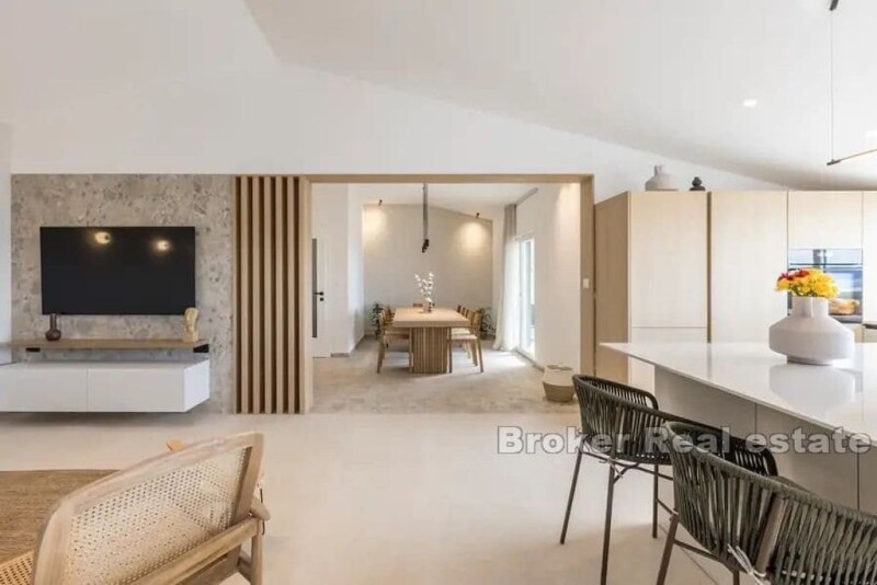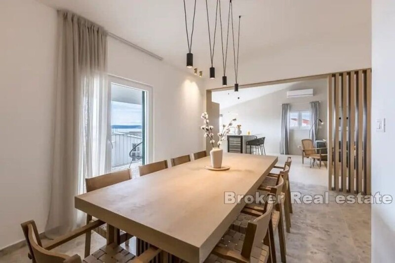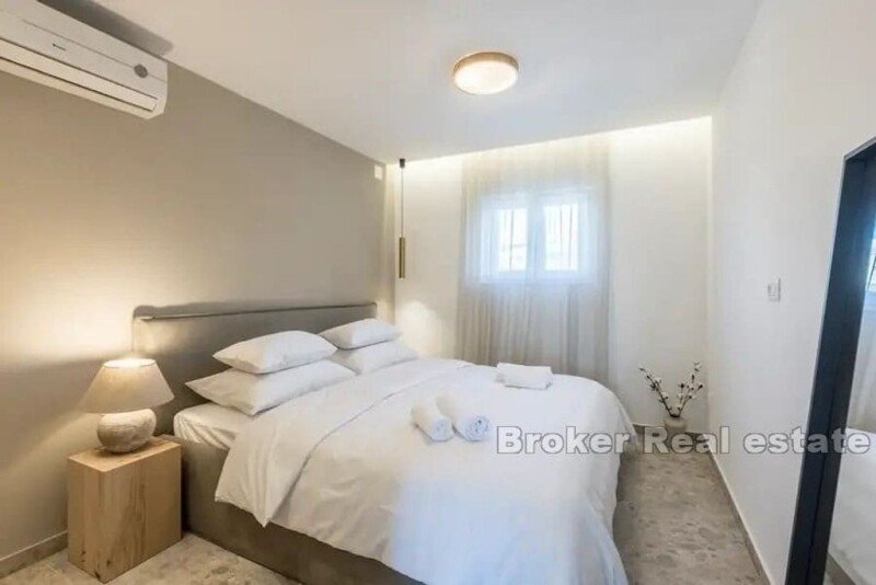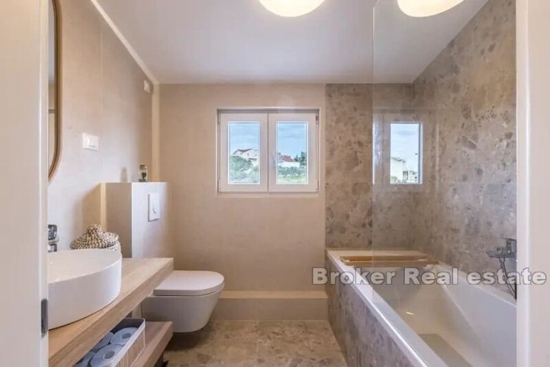 Modern villa with pool and sea view on Čiovo. The villa with a total living area of 240 m2 is located on a plot of land of 550 m2. On the ground floor there is an entertainment room equipped with a kitchen with a bar, darts, billiards, a cinema room, one bathroom and a room with a Finnish sauna. This floor is connected to the outdoor area where there is a heated hydromassage pool with a waterfall and an outdoor grill with furniture. On the first floor there is a bedroom with an attached bathroom, open concept kitchen with dining room and living room with access to the terrace that offers an open view of the sea. An internal staircase leads to the upper floor where there are four bedrooms, two of which have their own bathroom and exit to the balcony, the remaining two rooms they share a spacious bathroom with two sinks and a small kitchen. In addition to the swimming pool, the landscaped garden has a fenced area with artificial grass and children's facilities, and has five parking spaces. The villa is located in a quiet location near all the necessary facilities for living. 210 m from the sea, 5 km from Trogir, 10 km from Split Airport and 30 km from Split.