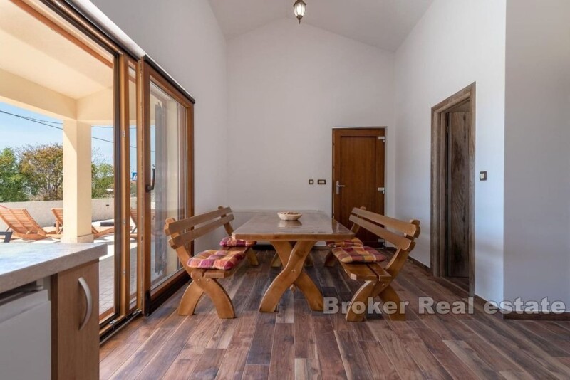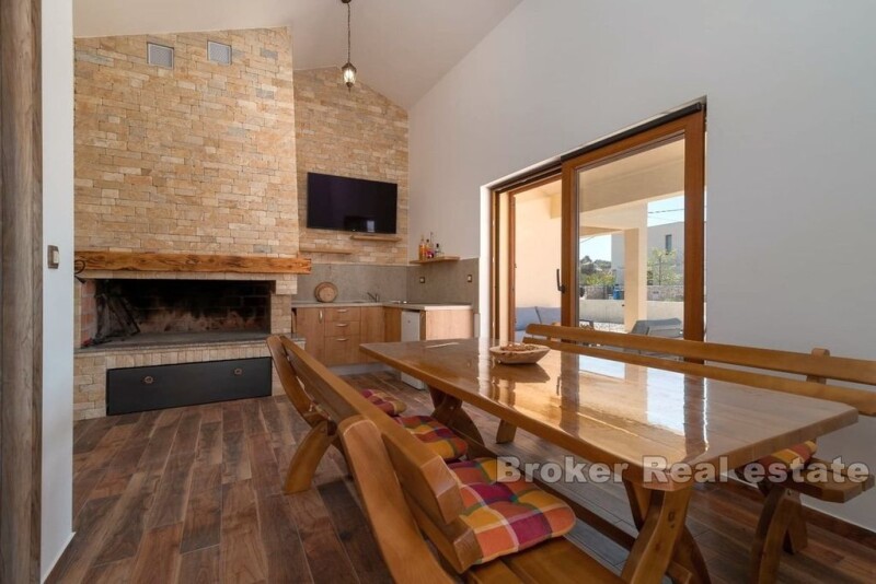 A modern family house located in a quiet part of the interior of Čiovo, just a few minutes drive from the well-maintained beaches and the historic town of Trogir. This detached house is located on a plot of 850 m² and spreads over two floors with a total area of 175 m². On the ground floor there is a spacious kitchen with dining room, bathroom and large living room with access to a large terrace with a swimming pool. Next to the pool there is a social area with a summer dining room, fireplace, additional toilet and storage room. On the first floor there are three bedrooms with private bathrooms, two of which have access to a spacious terrace with a beautiful sea view, and one additional bathroom. The outdoor area of the garden includes a swimming pool with a paved sunbathing area, an outdoor shower and three parking spaces. This property is ideal for those looking for relaxation and privacy in a peaceful environment, while at the same time wanting to be close to all the necessary amenities, and also represents a quality investment for tourism purposes.