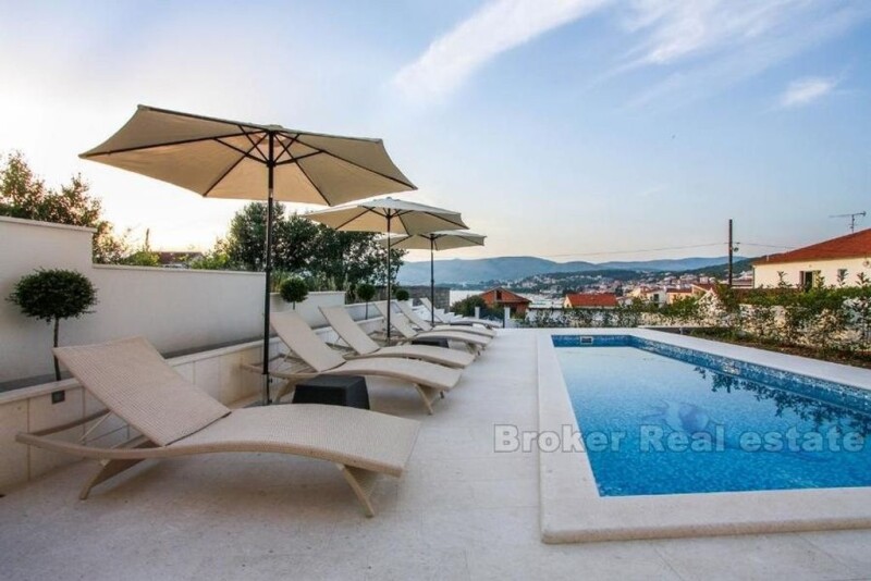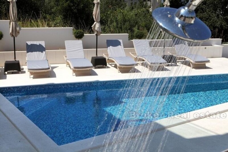 Luxury and modern villa, on three floors, overlooking the sea, with total living area of 180 m2, with 480 m2 garden, luxuriously furnished and decorated. The house was designed in a way that have in the basement fitness room, with a bathroom. On the ground floor there is a kitchen and dining room, from which is exit to the terrace with a swimming pool. On the mezzanine is a bedroom with en-suite bathroom. On the first floor is the living room, and another large bedroom with bathroom. On the second floor is situated third bedroom with a bathroom and a terrace with a beautiful sea view. Apart from this, the villa has a parking area for two vehicles, and on the side of the villa is a spacious terrace with a barbecue.
