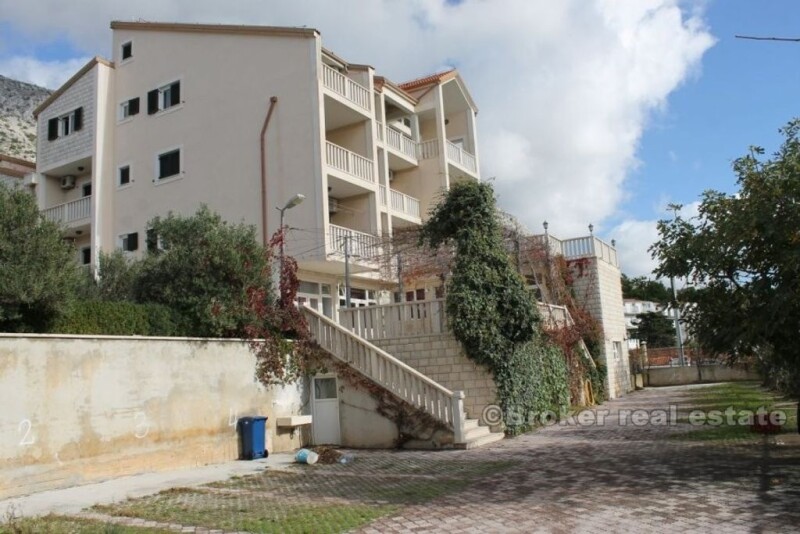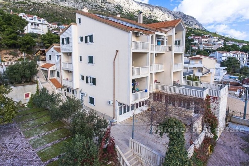 The business-residential building, with a purpose of a hotel, is located only a few kilometers from the town of Omis, in the village Stanići, in a convenient position right next to the main road, with a romantic view of the sea from all the accomodation units and close to beautiful pebble beaches. The facility is spread over 4 floors (ground floor and three floors), with a total living area of 1222 m2 and is located on a plot of total surface area of 1150 m2. Within the facility there are 25 accommodation units, of which 24 units are apartments and rooms (each with a bathroom), and a spacious two-storey apartment located between the third floor and the attic. All units are connected to the inner staircase from top to bottom, and the object itself communicates with the outer surfaces through 4 separate passages. The facility is conceptual built as a hotel and has been operating as a hotel for a long time, whereas for the last few years, due to the market demand, it has been transformed into apartment units and as such it is present in the market today. Certainly, given the business foundations on which this sale is based, the optimal number of accommodation units (each with sea view and balcony), a large restaurant with a kitchen and a bar with a spacious terrace on the ground floor, enough parking places for guests and proximity to beautiful beach and crystal clear sea, this offer seems to be a perfect business investment on this part of the coast, perfectly complemented by the immediate vicinity of the town of Omis with its rich cultural, gastronomic and sports offer. Since the construction of the building itself has given a lot of attention to all the necessary details, it has a very high quality construction that is recognized at first glance, and as the whole object is maintained within a family with lots of love, the interior is in very good condition and any additional investment would be more related to the modernization of furniture and business, rather than renovation and repair of the existing situation. Complete documentation is neat and the facility is ready for a new owner that will bring new business ideas, and all in all, business investment can be justified in a reasonable time period.