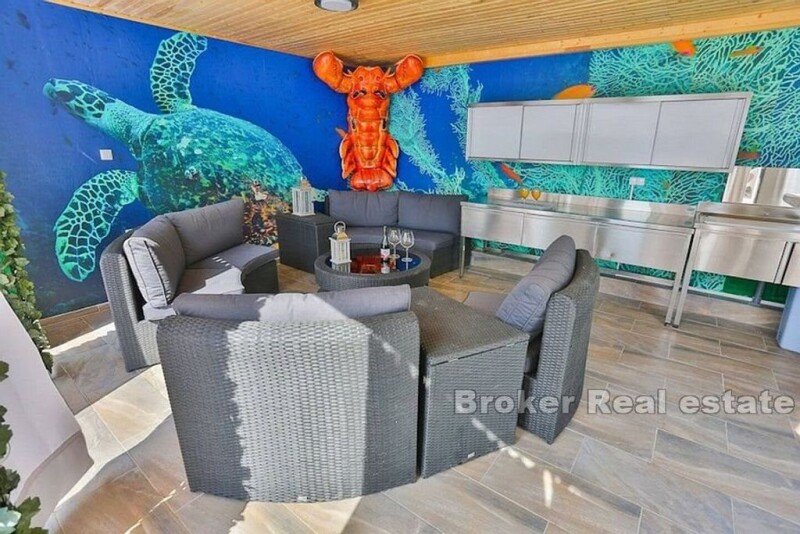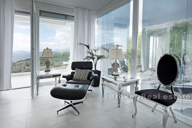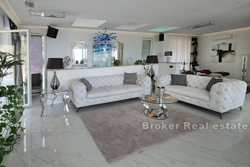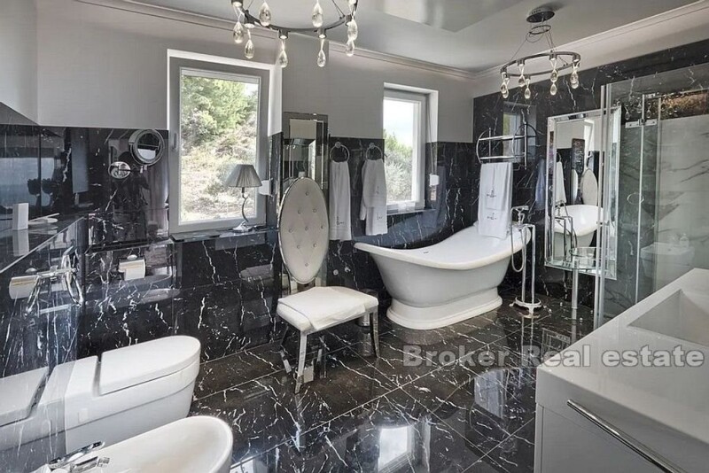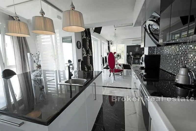 For sale is a modern and luxurious newly built villa located 10km from Split in Podstrana, 800m from the sea. The villa is built on 1200m2 of land and has 350m2 of living space. It consists of a ground floor and two floors, of which the ground floor and first floor have 2 separate entrances, which provides the possibility of using the villa as several separate units. All rooms are south oriented, protected by facade shutters and have a separate toilet with underfloor heating. On the ground floor there is a spacious three bedroom apartment with separate entrance and direct access to the pools, summer kitchen and spa area. On the first floor there are four bedrooms, three toilets, kitchen and dining room, while on the second floor there is a room with bathroom, kitchen and dining room. On both floors there are spacious terraces that can be accessed from the living room. The villa is equipped with extremely luxurious and modern designer furniture offering you not only elegance and luxury, but above all comfort. Murano glass chandeliers in every room, lacquered furniture, fully equipped Miele kitchen are just a part of the rich interior that delights in every way. The villa also offers the possibility of arranging the terrace in a circle designed for this. The exterior is completely lined with stone, which offers various facilities such as three outdoor pools, summer kitchen, spa area with pool, jacuzzi and sauna and garage space. The ideal location that provides peace and privacy, the rich content of the villa and the proximity of the urban environment are the perfect combination for summer vacation, but also for housing and make this villa a unique opportunity.