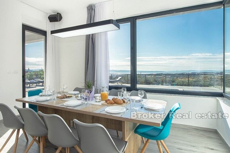 Beautiful villa with a total living area of 310 m2 in a quiet place near Split, built on a plot of 978 m2. It consists of two floors, and the interior of the house is modernly equipped with quality materials. On the first floor there is a bathroom, a bedroom and a kitchen with a dining room and a living room with access to a spacious terrace with outdoor furniture and a swimming pool. The terrace offers a magnificent view of the sea, which is an unavoidable factor. On the second floor there are three bedrooms, each with its own bathroom and exit to the balcony. The southern orientation ensures that the villa is sunny throughout the day. The villa has 6 air conditioners, the whole ground floor has underfloor heating and there is preparation for a heat pump. The villa was built in 2018. The price includes furniture. The property has a garage of 40 m2. Distance from the sea is 6 km, and from the center of Split 9 km. It is an excellent combination for a family vacation as well as for tourist rental, and is a great offer for investors as it offers them many opportunities.