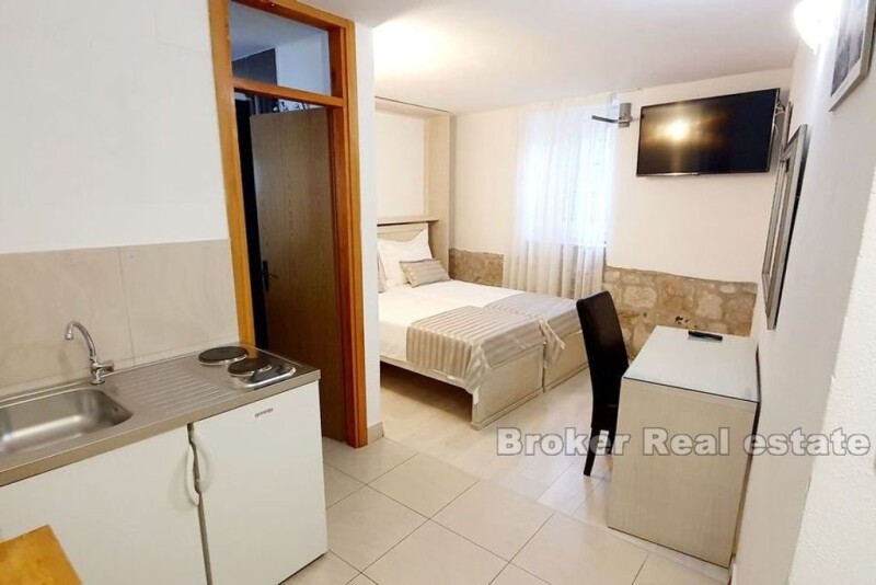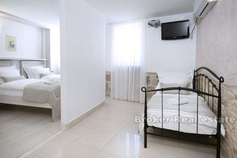 UNESCO-protected traditional Dalmatian stone house. Located in the city center, in a quiet location and also near the waterfront, the sea and Diocletian's palace. The house consists of five accommodation units spread over three floors. On the first floor there is a reception and two bedrooms with bathrooms. On the second floor there are two bedrooms with bathrooms. On the top floor, which is reached by external stairs, there are two studio apartments with a shared terrace. All units are comfortable and airy. Air conditioned and fully equipped. The interior of the building has been redecorated with a beautiful modern design retaining the original parts such as wooden beams and stone walls. The property is rented tourism and has a very good established business, excellent occupancy and guest ratings.There are many restaurants, shops and public parking nearby.