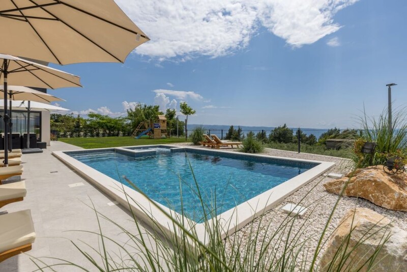 Location: Podstrana Built: 2021 Split center: 10 km Sea: 0.35 km Airport distance: 22 km Inside space: 400 m2 Plot size: 1170 m2 Bedrooms: 5 Bathrooms: 4 Swimming pool: 45 m2 Parking: 5 Air-conditioner Solar panel Sauna Patio Playground Garden.