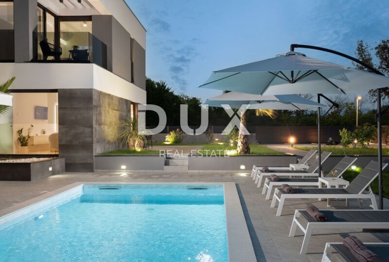 ZADAR, ZATON - A beautiful luxury villa with a heated pool A modern luxury villa in a new building is for sale in Zaton near Zadar in Northern Dalmatia. The villa is 500 m from the seashore, and the isolated position of this object allows complete peace and privacy. The building was built on a plot of 740 m2. The gross area of the villa is 220 m2, and the net area is 185 m2. On the ground floor there is a designer living room with a large glass wall, a dining room and an open space kitchen. On the ground floor there is also one bedroom with a bathroom, an additional toilet, and a storage room, i.e. a laundry room. On the first floor there are three more bedrooms and bathrooms. The interior of the villa, in addition to contrasting colors and contemporary design, stands out with an effective play of light and shadow in all rooms. All rooms are air-conditioned, and floor heating is carried out through both floors of the villa. The living room leads to the spacious courtyard of the villa, where there is a beautifully landscaped garden, a heated pool of 30 m2 and an outdoor shower. For the youngest, there is also a children's playground, and an outdoor dining table and an outdoor grill are at your disposal. 4 parking spaces are also available in the completely fenced yard. The town of Zaton is an extremely popular tourist destination, given the beautiful beaches in the area and the proximity to the urban center of Zadar, which is only 15 km away. Right next to Zaton is the historic town of Nin, known for its many interesting historical and cultural monuments dating back to the prehistoric era. For example, you can see the remains of the Roman forum there, and the remains of medieval and ancient Croatian war and merchant ships called kondurs were also found in Nin. In Nin there is also the longest sandy beach in Croatia called Kraljičina plaža. In the Nin lagoon there is also a locality with healing mud Peloid, whose beneficial properties were known even in Roman times. Dear clients, the agency commission is charged in accordance with the General Business Conditions www.dux-nekretnine.hr/opci-uvjeti-poslovanja Sara Večeralo Agent s licencom E- www.dux-dalmacija.com ZADAR, ZATON - Beautiful luxury villa with heated pool.