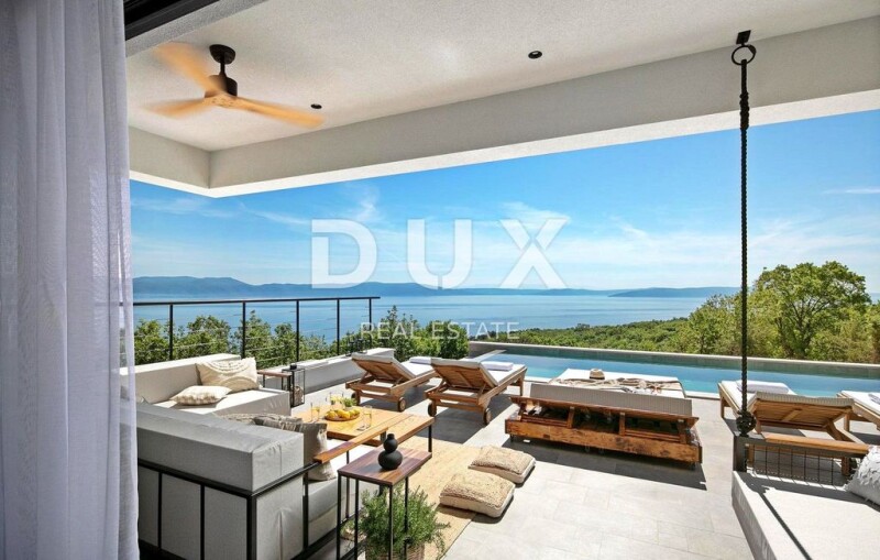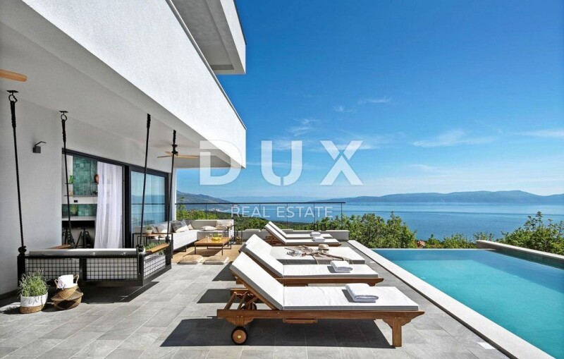 ISTRIA, RABAC - Extraordinary villa with spectacular sea views On the southeastern coast of Istria, where green hills meet the sea, where nature and heritage unite, just four kilometers apart, there are two towns with different but complementary characters - Labin and Rabac. Rabac, due to its white pebble beaches, rich Mediterranean vegetation and crystal clear and clear sea, has been called the pearl of Kvarner. Once a small fishing village, Rabac is today an attractive tourist destination that hides an abundance of cultural events in its network of picturesque streets. The green surroundings of Rabac and the picturesque hinterland invite you to adventure, exploration and recreation throughout the year. Not far from Rabac and Labin, in a small village by the sea, an extraordinary villa with spectacular sea views is for sale. It is located in a quiet village with a view that encompasses Učka, the city of Rijeka, the Kvarner islands and the crystal clear Adriatic Sea, and the position of this property offers exactly this enchanting and unique view. It is characterized by a modern design and the construction used top-quality building materials according to the highest standards for residential construction. The design was based on the cascading configuration of the terrain, orientation towards the views of the blue sea and the charming landscape that surrounds it, and the interaction of the exterior and interior. The concept of the functional interior layout that extends over three floors is based on practicality, open floor plan and airiness. It stands out with a large number of glass walls, top-quality equipment and carefully selected elements of modern furniture, creating an elegant and aesthetically appealing ambiance filled with comfort. The basement consists of a playroom, toilet and an additional room that can be arranged according to your own wishes and preferences (wellness zone, office, bedroom). The ground floor consists of an open-concept space that unites the kitchen, dining room and living room, a bedroom with its own bathroom, a guest toilet and a laundry room. The first floor consists of three bedrooms with their own bathrooms and a terrace. The yard is fenced, minimalistically decorated with grassy areas and indigenous plants, providing privacy and peace, and the perfect harmony is rounded off by a swimming pool with a sunbathing area and a summer kitchen. There are parking spaces for 4+ cars and a Wallbox charger for electric vehicles is installed. This perfectly composed property is an exceptional opportunity for a comfortable family life as well as for investment in a tourist rental business. Dear clients, the agency commission is charged in accordance with the General Terms and Conditions: www.dux-nekretnine.hr/opci-uvjeti-poslovanja Iva Zajc Agent s licencom E- www.dux-istra.com Stefani Kapel Agent s licencom E- www.dux-istra.com ISTRIA, RABAC - Extraordinary villa with spectacular sea views.