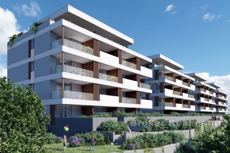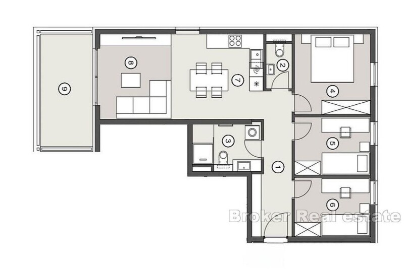 A three-room tent in a new building with two garage parking spaces near the school. The project is in the phase of obtaining a building permit and construction is expected to start soon. It is located on the second floor of a small residential building and covers 67 m2 of living space. The orientation of the tent is south and has a view of the sea. It contains a hallway, kitchen, one bathroom and toilet, three bedrooms and a living room with access to a 5 m2 balcony. The total area of the entire apartment with a balcony is 73 m2. In addition to this tent, there are two connected garage parking spaces and a shed. The location is excellent because it is located near all the necessary facilities for life, such as a school, kindergarten, supermarkets, cafes and the beach. It ensured easy and quick access to other city roads.