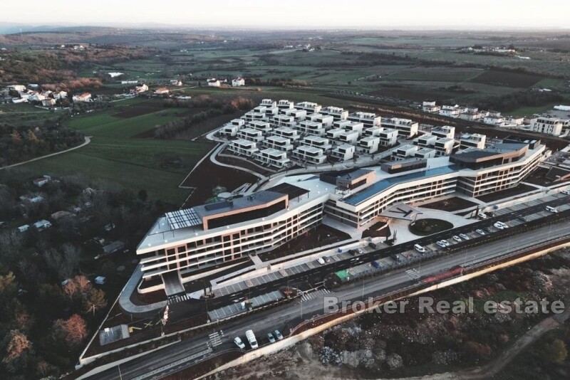 Located on the very coast of the sea, in the beautiful Savudrij, the luxury resort offers an unsurpassed vacation experiance, and inside it, there is an elegant apartment of 80,40m2 with a terrace of 11,40m2, ideal for enjoying the scenery offered by resort's surroundings. This luxuriously furnished apartment is designed to combine iltimate comfort and sophistication, providing the perfect space for relaxation on the Adriatic coast. The apartment consists of an entrance hall that leads to a practical storage room/laundry room of 1,80m2. The apartment also contains two bedrooms of size S1 – 15,90m2 and S2 – 13,90m2, a modern bathroom of 5,80m2 and an additional toilet of 1,90m2. In the central part of the apartment, there is an open space of 32,30m2 in which there is a kitchen, dining room and living room. Each bedroom and living room opens onto a terrace. All apartments and suites have flawless use of the resort's services. For each apartment, you can choose a decoration package and a parking space, while VAT is not included in the price. The prices below refer to two-room apartments in the resort. One-room apartments in the resort are also available under codes: ID: 2046/38, ID: 2046/41, ID: 2046/44 FIRST FLOOR: C17 – 80,40m2 + balcony 11,40m2 – 460.266,84€ C31 – 81,50m2 + balcony 13,13m2 – 555.390,00€ SECOND FLOOR: C32 – 80,40m2 + balcony 9,90m2 – 535.597,92€ C33 – 83,40m2 + balcony 9,08m2 – 546.470,10€ C46 – 83,30m2 + balcony 9,15m2 – 546.470,10€ C47 – 81,50m2 + balcony 11,48m2 – 566.497,80€ THIRD FLOOR: C61 – 83,30m2 + balcony 10,50m2 – 562.228,59€.