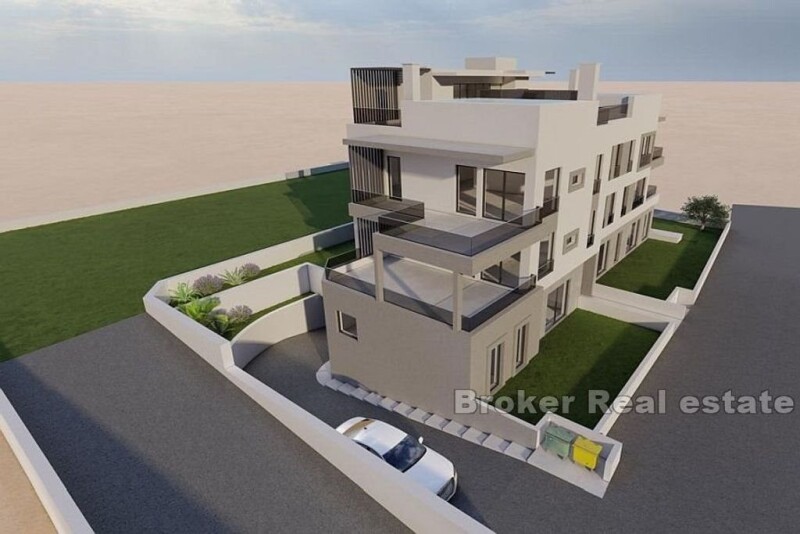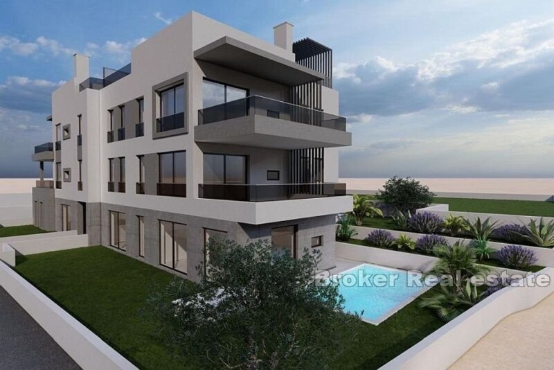 A luxury building with an elevator and a total of six apartments is under construction on the southern side of the island of Čiovo. In a great location, with a view of the sea and very close to the sea. The facility is oriented to the south and the access road leading to the facility is wide. The building will have a total of four floors. A garage will be located in the basement, from which the apartments will be accessible by elevator. There will be two apartments on each floor, one with two bedrooms and one with three bedrooms, each with two bathrooms. The facility will be unique because of the four swimming pools it will have. Both ground floor apartments will have their own swimming pool, while the penthouse apartments will share a roof terrace that will also have two swimming pools. Apartments on the first floor will have massage tubs. Each apartment has a parking space in the garage. Quality materials will be used in the construction and furnishing (tiles and high class sanitary ware, air conditioners in every room, underfloor heating…). Apartments are an excellent choice for all those looking for an apartment in a quiet location, near the sea. GROUND FLOOR S1 – 89,03 m² + pool 11,90 m² – 430 000 € S2 – 90,74 m² + pool 19,55 m² – 480 000 € FIRST FLOOR S3 – 71 m² + terrace 32,71 m² – 360 000 € S4 – 72,53 m² + terrace 18,57 m² – 380 000 € SECOND FLOOR S5 – 73,50 m² + balcony 26,57 m² + roof terrace with pool 65,01 m² – 630 000 € S6 – 81,54 m² + balcony 7,58 m² + roof terrace with pool 79,33 m² – 630 000 €.