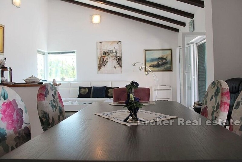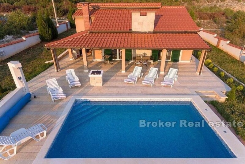 For sale is a modern house located near Split, built in 2017 on a plot of 1000 m2. It consists of a total of 150 m2 of living space that spreads over one floor. The house consists of three bedrooms, bathroom, spacious kitchen with dining area and living room with access to the terrace with outdoor furniture and barbecue. The interior is modernly equipped with quality materials dominated by neutral colors that contribute to the relaxing atmosphere of the house. The house is surrounded by a maintained garden of Mediterranean plants as well as a beautiful pool that dominates the entire exterior, and around which there is a sunbathing area with outdoor sun loungers. A soothing view of the mountains and peace and absolute privacy is a reason worth investing in and an unavoidable factor that this property offers. The property has three parking spaces, one of which is covered. The house is excellent for tourist rental because it has a complete offer that includes a children's playground and is for sale fully furnished. The distance of the property from the center of Split is 15 km and from the airport Split 10 km. The distance of the house from the sea is 8 km. There is a project to build a tunnel that will ensure even better connection of the property with the center of Split. It is an investment that is definitely worth considering because it offers a return on investment and on the other hand can be used for a quiet family vacation.