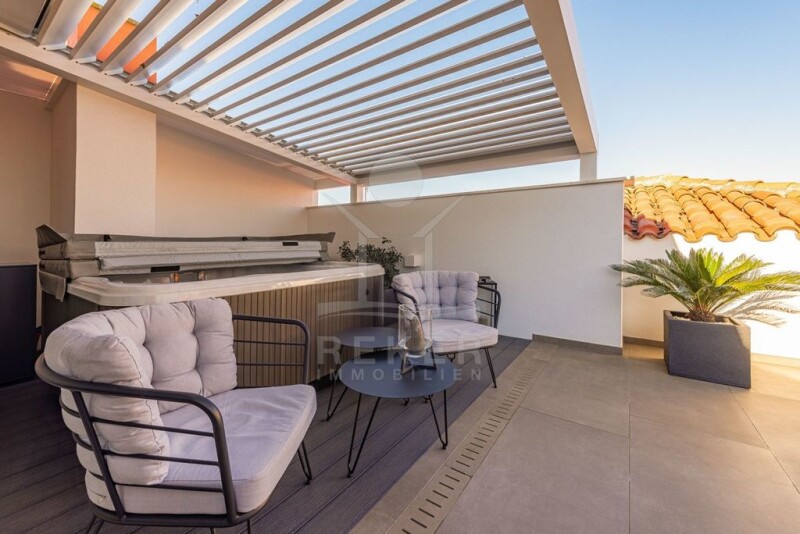 High quality and stylish: duplex apartment with luxury amenities in the center of Zadar Immerse yourself in the luxury and style of this exquisite duplex apartment in the heart of Zadar! With a distance of just 70 meters to the sea and an unbeatable location in the city center, you will be able to enjoy the vibrant life of the city to the fullest. This apartment is sold furnished and offers you an experience of absolute perfection. From electric blinds and an awning to high-quality walnut-colored parquet and a harmonious color scheme, every detail is carefully coordinated. Relax in the whirlpool after a long day or enjoy the view from the roof terrace. This architectural jewel promises the highest level of luxury and comfort. ~.