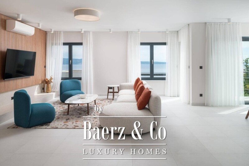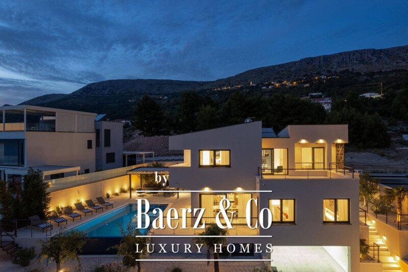 Near Split, Podstrana, elegant luxury villa with garage, swimming pool, terrace, garden and balconies with panoramic sea views. The house is ready to move in, fully furnished and equipped. Newly built villa with swimming pool, modern design, high standard of construction quality and level of equipment, located on a hill and has a beautiful panoramic sea view. The villa has a gross area of 306 m2, of which 240m2 is net, located on a plot of 605 m2, is located 300 m from the sea, and extends over three floors - basement-basement with garage, ground floor, mezzanine and first floor. There is outdoor parking for two cars on the driveway, and in the basement there is a garage and a storage room that is connected to the residential part by an internal staircase. In front of the building there is a large terrace with a swimming pool, a sunbathing area and a landscaped garden. It has 4 luxurious bedrooms, all with their own en suite bathrooms, a large spacious living room, an open-plan kitchen and dining room with access to a spacious terrace. The basement consists of a two-car garage, a cellar, a technical room, a laundry room and a staircase. The ground floor consists of a kitchen, a storage room, a spacious open-plan dining room and living room, a shared toilet, one comfortable bedroom with its own bathroom, and a staircase. In front of the building is a terrace with a 39.5 m2 swimming pool, an outdoor shower with hot water, an 85 m2 garden with olive trees and indigenous plants and a built-in self-watering system. The outdoor pool has water heating and a heat pump, and water filtration is by electrolysis. The first floor consists of three spacious, comfortable bedrooms, each with its own bathroom. Two rooms have a loggia on the south side from which there is a beautiful panoramic view of the sea and the bay. The staircase leads to the green roof. All rooms and rooms are air-conditioned with inverter air conditioners and underfloor heating is installed throughout the building (except for the basement of the fun room). High energy efficiency is ensured by a 10 cm thick polystyrene facade on the outside and 6 cm thick stone wool on the inside. The partition walls are Knauf boards and acoustic wool, which ensures superior sound insulation. A solar hot water system is located on the roof, and the staircase inside the building is made of stone with integrated LED lighting. All windows are anthracite aluminum, triple-layered glass, automated shutters, high-quality stone inside and outside the building, a fence around the building, gutters in the facade.... The villa is located in a quiet location, ideal for anyone who wants peace and privacy in a beautiful and natural environment. The excellent atmosphere and luxuriously equipped holiday home are the ideal combination for a pleasant holiday. The swimming pool and common lounge for socializing are excellent for relaxation and all this in the private atmosphere of the fenced plot - simply perfect. Podstrana is a tourist resort 5 km from Split and 28 km from Split Airport. For any additional information, please contact me at the above contacts.