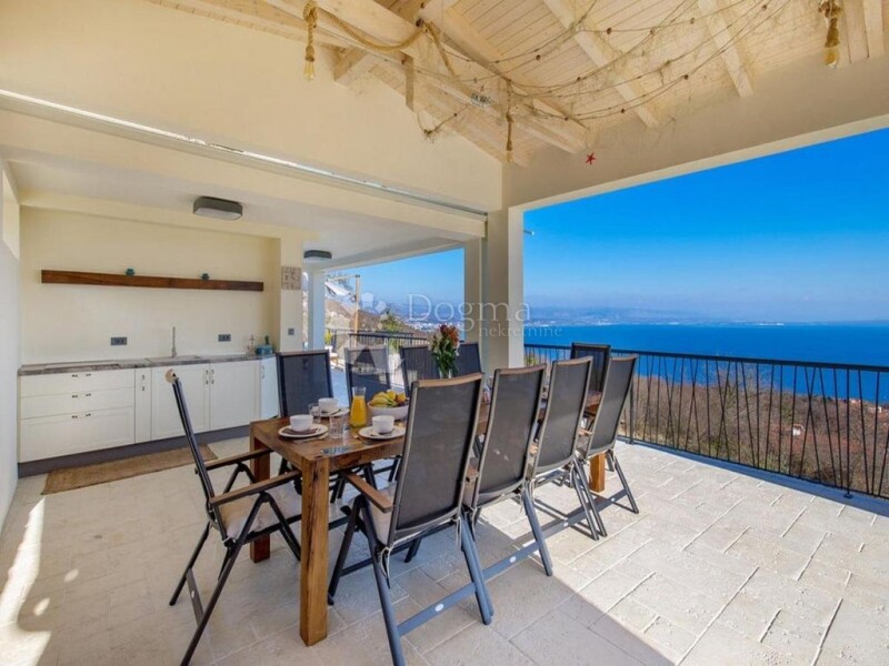Ičići, Poljane, Villa 170m2 We are mediating the sale of a modern villa with a pool (32m2), a large terrace, and a panoramic sea view. Surrounded by greenery, peace, and quiet, it offers maximum privacy. The villa has 4 bedrooms, each with its own bathroom, located on the upper floor. On the ground floor, there is a living room with a kitchen and a bathroom. The centerpiece of the house is the pool and the sunbathing area, where you can relax with cocktails from the terrace bar. Since most time is spent here, the terrace is additionally equipped with a kitchen, a dining table, and a barbecue. Outdoor parking and a children's playground are available on the property. For all details, please contact our agent KARIN ŠTIMAC, 098/286 734.