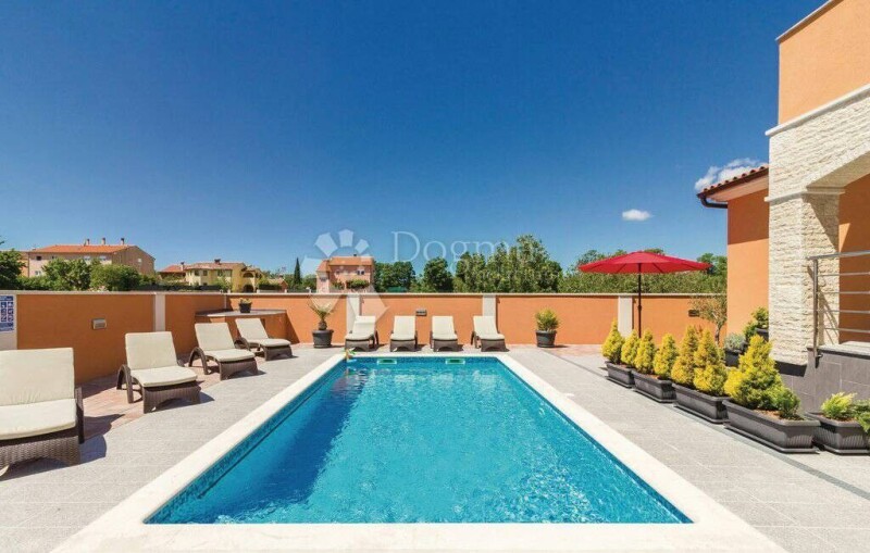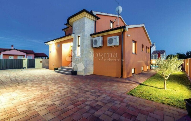 Not far from the center of ancient Pula is this modern villa with pool. It spreads over three floors: basement, ground floor and first floor. In the basement there are two rooms and a toilet with shower. There is a playroom in one room and the other is intended for a sauna and relax zone. On the ground floor there are two bedrooms, each with its own bathroom, living room, kitchen and dining room, guest toilet, pantry and engine room where there is a boiler 300 l for hot water obtained from solar panels located on the roof of the villa. From the living room and one of the bedrooms there is an exit to a common covered terrace and a garden where there is a 25 m2 mosaic pool. Upstairs are two bedrooms each with its own bathroom and one of the rooms has access to the terrace. Heating and cooling is by eight air conditioning units distributed in all rooms of the villa. The villa is well insulated with a 10 cm styrofoam thermal facade. The windows have quality PVC carpentry in the color of wood, the floors are ceramic. Within the fenced yard of 550 m2, parking for 5 vehicles is provided. Next to the pool is a sun deck and a stone barbecue. The port is on automatic closing. The villa is located in a quiet street without traffic and close to beaches and tourist centers and essential facilities for the life of modern man. It is fully furnished and as such is for sale.