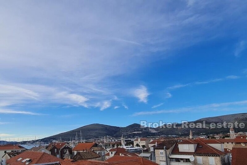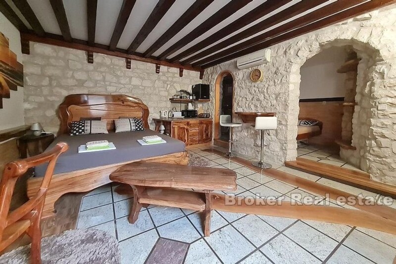 Stone house in a row with 500 years of history, with two entrances, located near the Trogir bridge on Ciovo, surrounded by decorated stone houses, in the old town. The total area is approx. 140m2 divided into four floors: The ground floor which is currently used as a tavern, and is equipped with a bed, fireplace and bathroom. First floor which is in nature a studio apartment with a bedroom, kitchen, bathroom and another separate bedroom. Second floor which is also in nature a studio apartment with a bedroom, kitchen, bathroom and another separate bedroom. The first three floors are approximately 40m2 each. Third floor with a closed summer kitchen (approx. 20m2) equipped with all appliances and a terrace overlooking the sea. Fourth floor, essentially a roof terrace of approx. 30m2, with open views of the city and the sea. The floors are connected by internal spiral staircases. The house has been renovated in stages over the last 19 years, and the owners have placed emphasis on preserving the originality using only solid oak wood, stone and granite in the renovating. Water pipes and electrical cables have been changed, concrete slab have been put on the floors instead of wooden beams, and insulation in the floors has been installed. All furniture is made by hand, to measure. In terms of infrastructure, the house is connected to the city water supply and sewerage, electricity network, and has solar panels for water heating. Nearby are shops, stores, restaurants and cafes, bus station, ACI marina, ATMs and more.