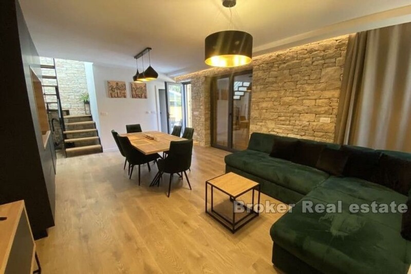 A beautiful newbuilt stone house near Zadar. Unique and truly interesting house located on a plot of 158m2 with a swimming pool and its own parking lot. It is located in an area that exudes peace and privacy, while at the same time all important facilities are in the immediate vicinity. The property is built from renowned materials such as stone from the barracks from 1905, which is combined with reflective glass that hides the interior. When decorating the interior and exterior of the house, materials of exceptional quality were used. The doors and windows are made of Siberian pine, real white stone was used for the door frame, which helped with insulation and the wall thickness of 54 cm, while solid oak was used for the interior staircase. The house with a total living area of 102m2 consists of a kitchen, dining room, two bedrooms and two bathrooms. The property is equipped with mechanical underfloor heating with additional 3 air conditioners. The house has a 23m2 swimming pool with a dark surface for added effect and a heat pump that can be regulated. With this truly interesting property, you will get a complete feeling of home not only with the perfect combination of modern and indigenous, but also with the environment and nature that surrounds it. The town center and the sea are 400 meters from the house, while Zadar is less than 20 kilometers away and the airport 30 kilometers away.