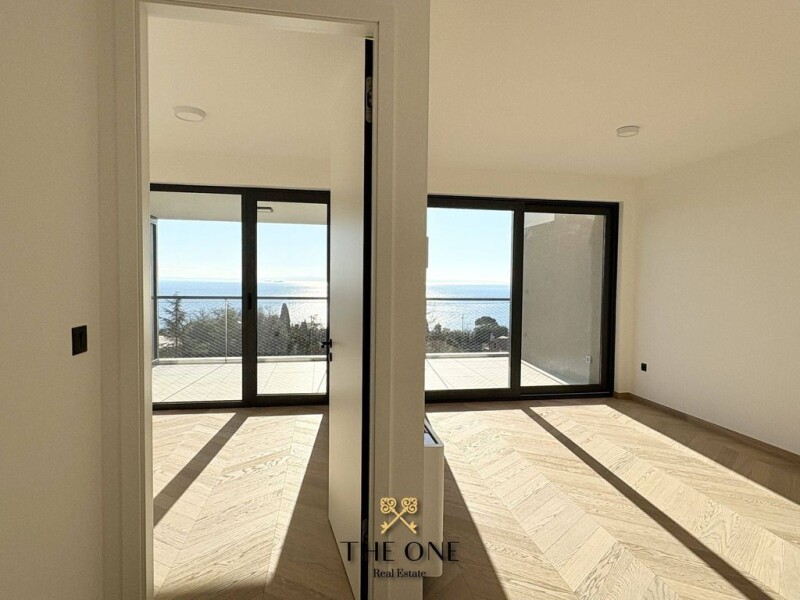 Luxury apartment with a sea view is located only 300 m from the sea and the center of Opatija. The combination of comfort, sophistication and a spectacular panoramic view are just some of the advantages that this apartment offers. The apartment of 180 m2 is located on the 2nd floor of the building and features a spacious open-concept living area consisting of a kitchen with a dining room and a living room. Down the hall you will find three bedrooms, one of which has its own bathroom, walk-in closet and access to the terrace. There is also another bathroom and a toilet. The apartment features an additional living space that can be used as a separate apartment. It consists of a kitchen with dining area and living room with access to a balcony, bedroom and bathroom. The apartment comes with a storage room in the basement and two parking spaces in the garage. High-quality materials and equipment are the features of this new building: – a heating/cooling system using a water-based heat pump and underfloor heating in the bathrooms, ALU external joinery with electric blinds, burglar-proof and fire-proof entrance doors, modern and high-quality interior joinery, sanitary equipment of modern design by well-known manufacturer, multi-layer parquet in all rooms, high-quality floor and wall ceramics in the bathrooms, elevator from the garage to the apartment. The location of this apartment is extremely favorable because it is close to the center of Opatija, allowing you to enjoy all the benefits that this tourist town offers. Natural beauty, rich history, sumptuous architecture, top gastronomy, shops and other numerous facilities make Opatija an ideal destination both for year-round living and for a relaxing summer vacation. A modern new building is the ideal choice for everyone who wants to enjoy luxury near the center of Opatija and with the most beautiful view of Kvarner! VAT is included in the price of the apartment, the buyer does not pay real estate sales tax. Not what you are looking for? Contact us for a personalized approach and a discreet tailor-made property finding service. THE ONE E- www.theone.hr THE ONE Real Estate E- www.theone.hr Spacious apartment with a panoramic sea view in Opatija.