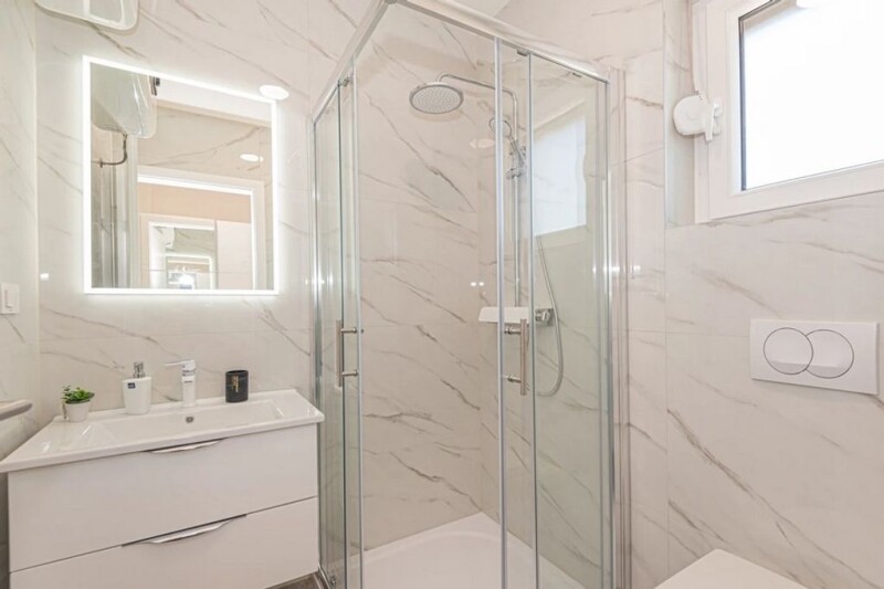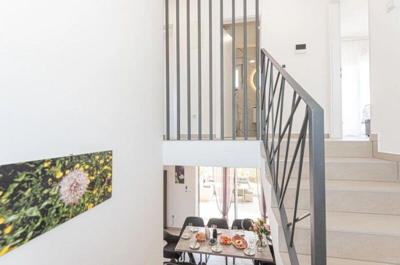 Semi-detached house with pool and garden This offer is for a modern, newly built semi-detached house with swimming pool and garden in Sibenik, Dalmatia. This semi-detached house (registered as a maisonette apartment with garden) has a garden of approx. 390 m² and offers a living space of approx. 132 m² with the following rooms: Lower floor: living room, kitchen, dining room, bedroom, bathroom Upper floor: 3 bedrooms, 2 bathrooms, 2 terraces Outside there is a swimming pool, a summer kitchen and two parking spaces. The semi-detached house is in a quiet location near the beach of Martinska. Distance to the sea: approx. 800 m Please contact us for further information and viewings. www.panorama-scouting.de | Properties in Croatia | only properties with sea views and directly on the sea www.panorama-scouting.com | Real Estate Croatia | Seafront Properties And Properties With Sea Views Deutsch | English | Français | Italiano Swimming pool, 2 parking spaces, summer kitchen, storage room, garden (approx. 390 m²).