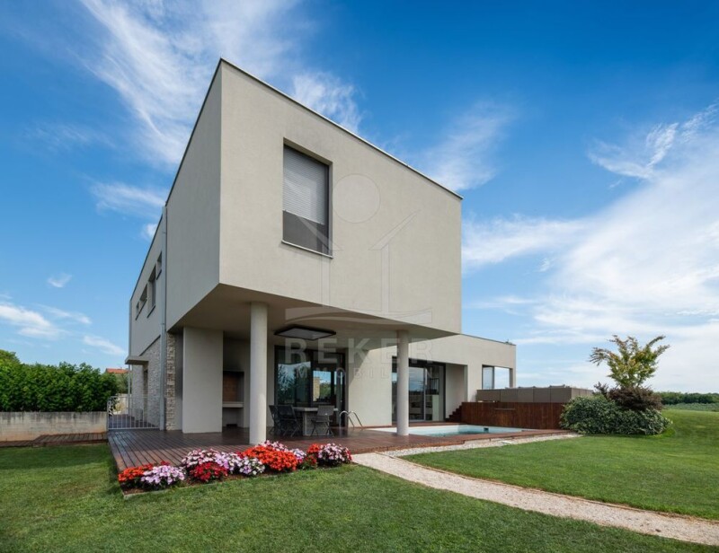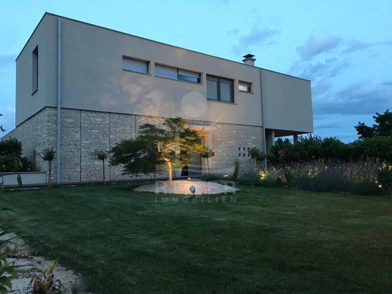 Dream villa in a TOP location on a large plot surrounded by olive groves In a quiet location with a wonderful view of the nearby olive groves and the deep blue sea. The view stretches far as far as Umag; this is how this wonderful dream villa on a large plot welcomes you. The old town is about 2 km away and the sea only 1 km, but the location of the villa offers you peace and a discreet retreat on the large plot of 5,000 m². Due to the grandeur of the plot, you also have a wonderful view of the sea and can even see as far as the old town of Umag.... Let yourself be inspired by the pictures of the extraordinary location and, like the villa, become part of the wonderful Istrian olive groves and part of the landscape. Unspoiled nature as far as the eye can see. Gentle hills sloping down to the sea, lined with wonderful olive trees. Simply extraordinary! A modern dream villa of the highest class, planned by a renowned architect from Zagreb for the owner and his family, this luxury villa meets the highest requirements and wishes. The term luxury does not describe this extraordinary property adequately and does not really reflect what the new owner will love. The large Mediterranean garden was created with a lot of love and exceptional planting by the owner, so that the flowers bloom from spring to November. The architect was inspired by the course of the sun in the design and execution, so that the rooms are always at a pleasant temperature. You will be impressed by the underground car park, cinema hall, wellness area ~.