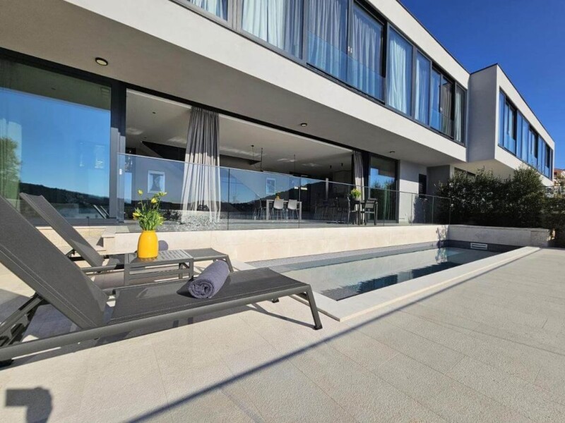 Location: Šibenik Built: 2019 City center: 19 km Airport distance: 38 km Inside space: 146 m2 Plot size: 343 m2 Bedrooms: 3 Bathrooms: 3 Swimming pool: 36 m2 Parking: 3 Air-conditioner Cameras Patio Garden.