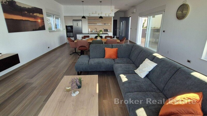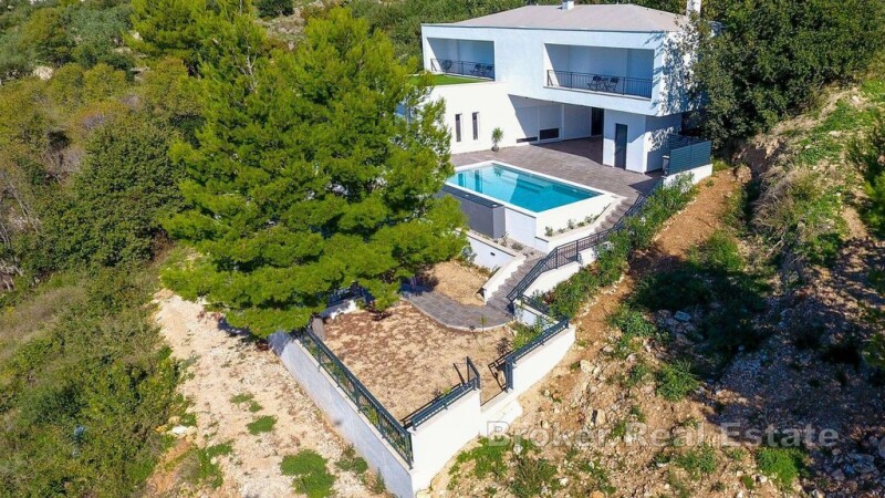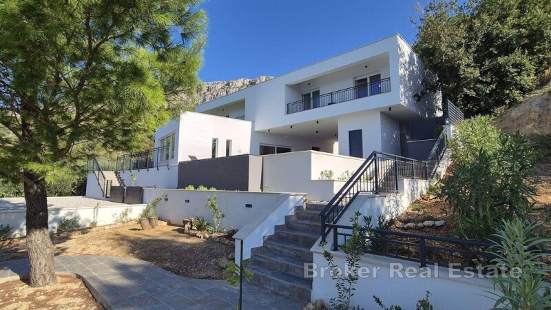 Newly built modern villa with swimming pool and panoramic sea view, for sale, located in a quiet elevated position with panoramic sea view, near the town of Omiš. The villa is located on a plot of 814 m2, and covers a total of 240 m2 of living space. The villa consists of three floors, divided into a basement floor, a ground floor and an first floor. On the basement floor there is a garage, a engine room for the pool, a hot water tank (heated by two solar panels) and a recreation area. On the outer part of the ground floor there is a swimming pool, sunbathing area, sauna, outdoor shower, storage room and a large covered terrace with a barbecue. The inner part of the ground floor consists of a spacious living room with an open-plan dining room and kitchen, a pantry, a large room designed as a laundry room, and a toilet for guests.. Stairs lead to the first floor where there is a large hallway connecting 4 spacious bedrooms, each with an en-suite bathroom and access to the belonging terrace. Due to the elevated terrain on which it is located, the villa has a beautiful panoramic view of the sea, which provides the perfect ambience for a stay and complete privacy for its users. The villa is fully equipped and furnished, and is being sold as such. A very interesting property that has been planned to provide maximum comfort and achieve comfortable living. Without many neighbors and not much traffic nearby, the villa is an excellent choice for buyers who prefer a combination of a modern and less urban area.