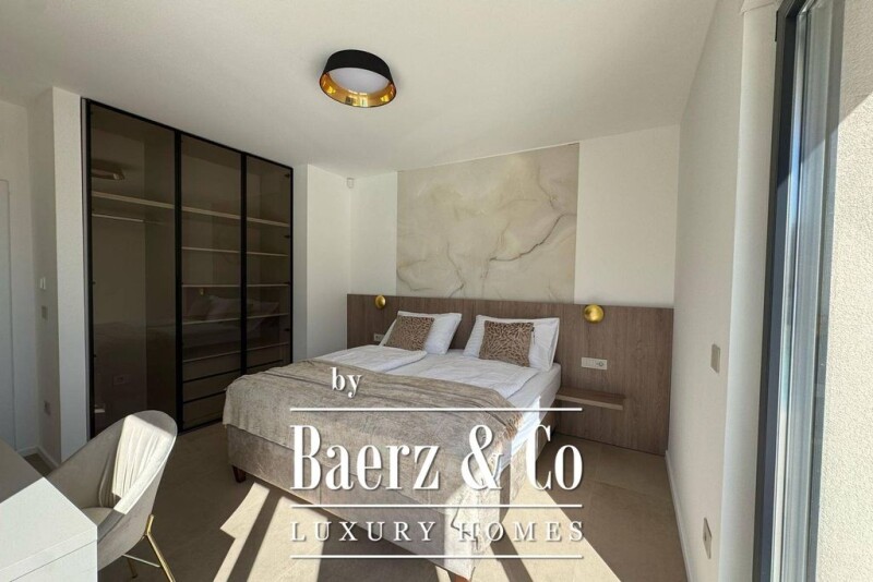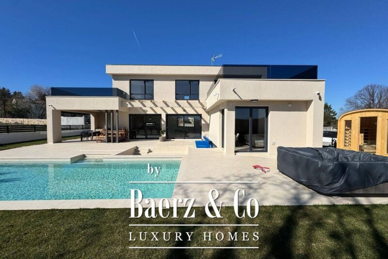 In the vicinity of the magical town of Rovinj, there is a modern new building with a swimming pool. The property is characterized by a convenient location, quality construction and airiness of the space. The house is divided into two floors, and the total net living area is 210 m2. The ground floor consists of an open-concept space that unites the living room with kitchen and dining room, bedroom, bathroom and storage room. While the internal staircase leads to the first floor where there are two additional bedrooms with private bathrooms and exits to spacious uncovered terraces. The described space of the living room with kitchen and dining room provides communication with the landscaped garden, which perfectly fits the 40 m2 heated swimming pool, sunbathing area, sauna, jacuzzi, covered summer kitchen, parking spaces and enough free space for socializing and having fun. It also contains an irrigation system. The house itself is equipped with electric underfloor heating, air conditioning for heating and cooling the rooms, electric shutters, video surveillance, alarm, all necessary appliances and furniture and is being sold as such, making it an ideal opportunity for a peaceful family life as well as an investment for the purpose of tourist rental. For more information, please feel free to contact us.